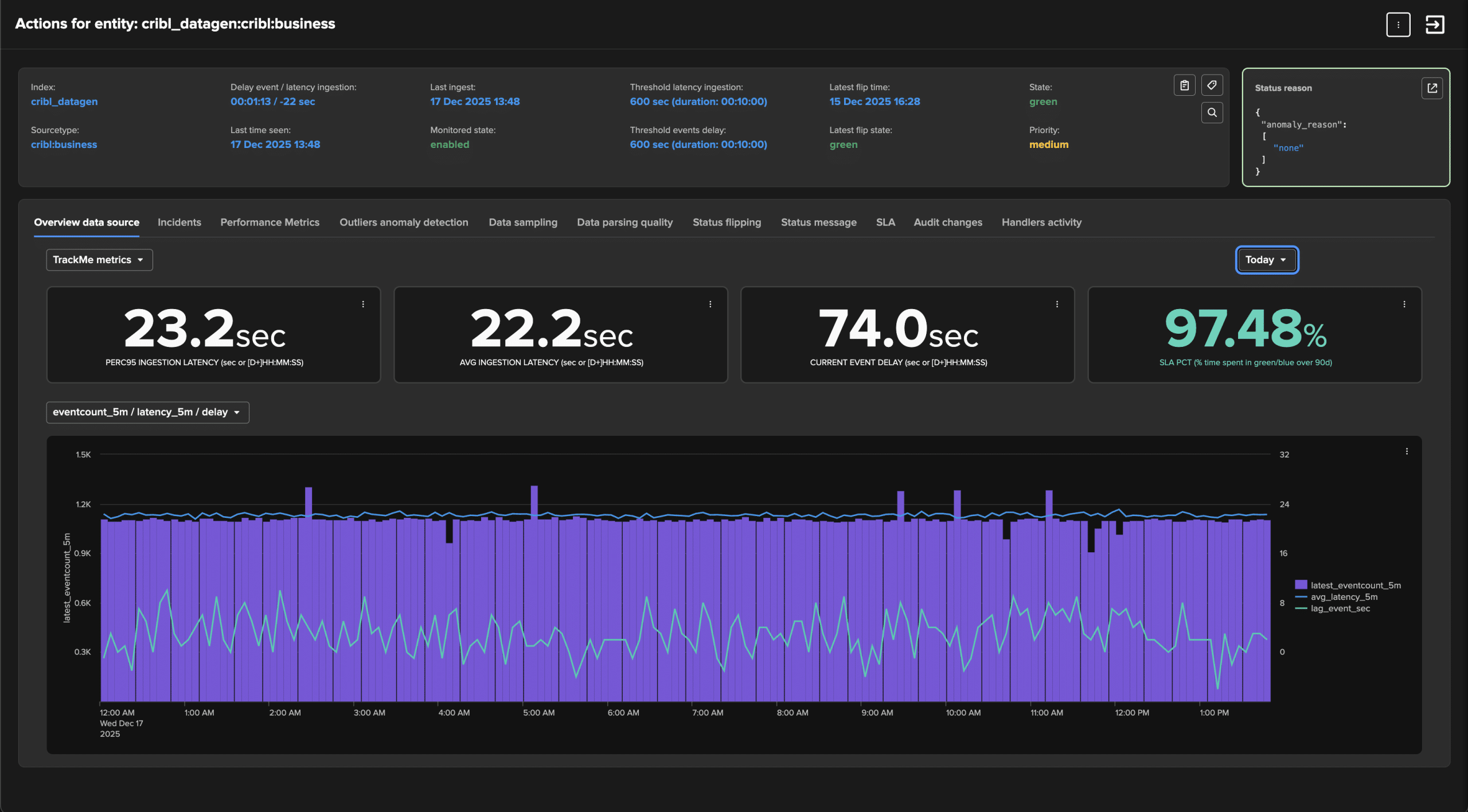 TrackMe's Splunk feed tracking components address this challenge like no other solution. A comprehensive and feature-rich suite offers the flexibility needed to ensure your feeds are available when expected, with optimal performance and continuous quality control.