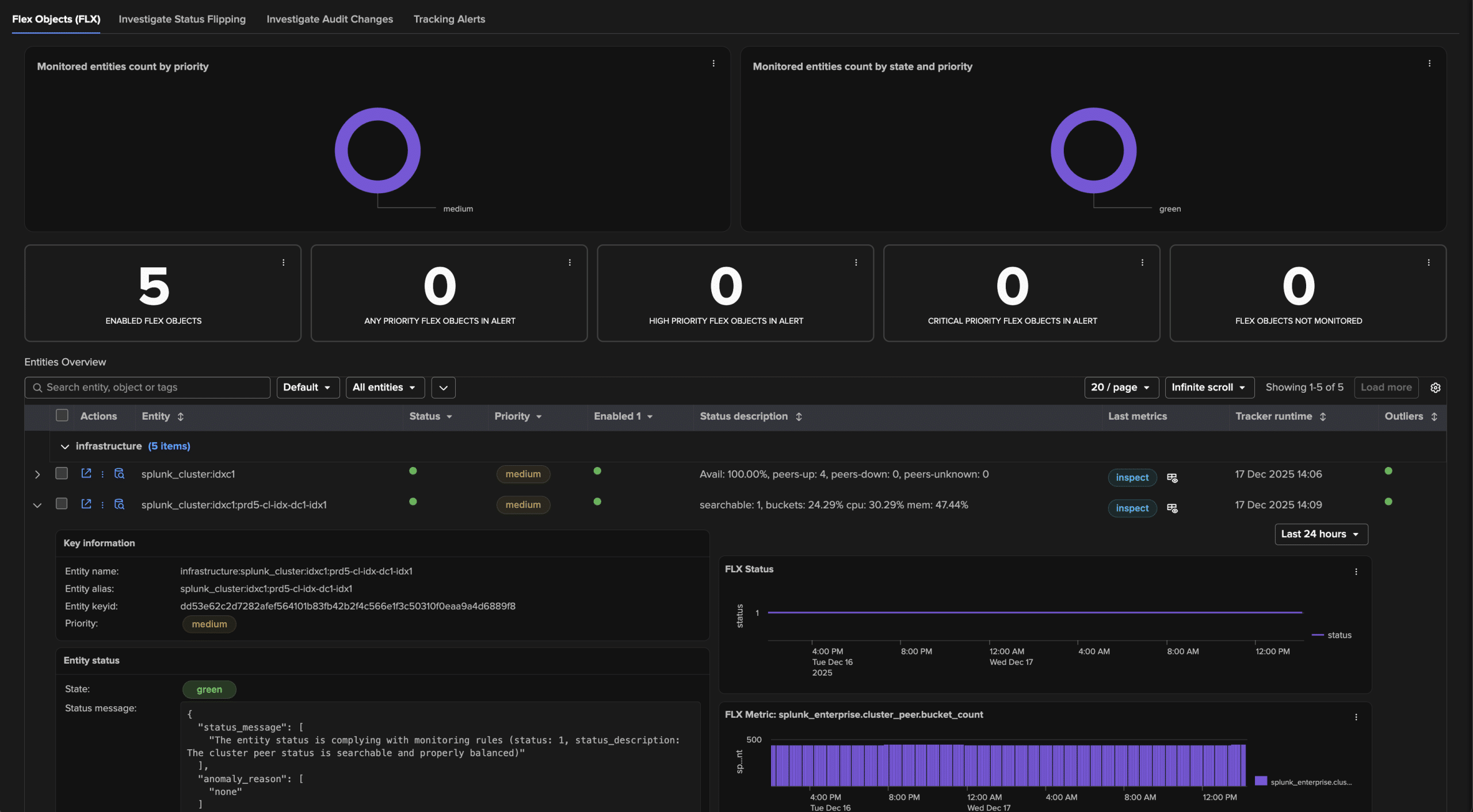 Flex Objects enable monitoring of various use cases, from remote Heavy Forwarder inputs to other applications. They integrate seamlessly into TrackMe's distinctive workflow, tracking status changes, automatically recycling high-performance metrics, utilizing Machine Learning Outliers, employing flipping status and Notables, and more.