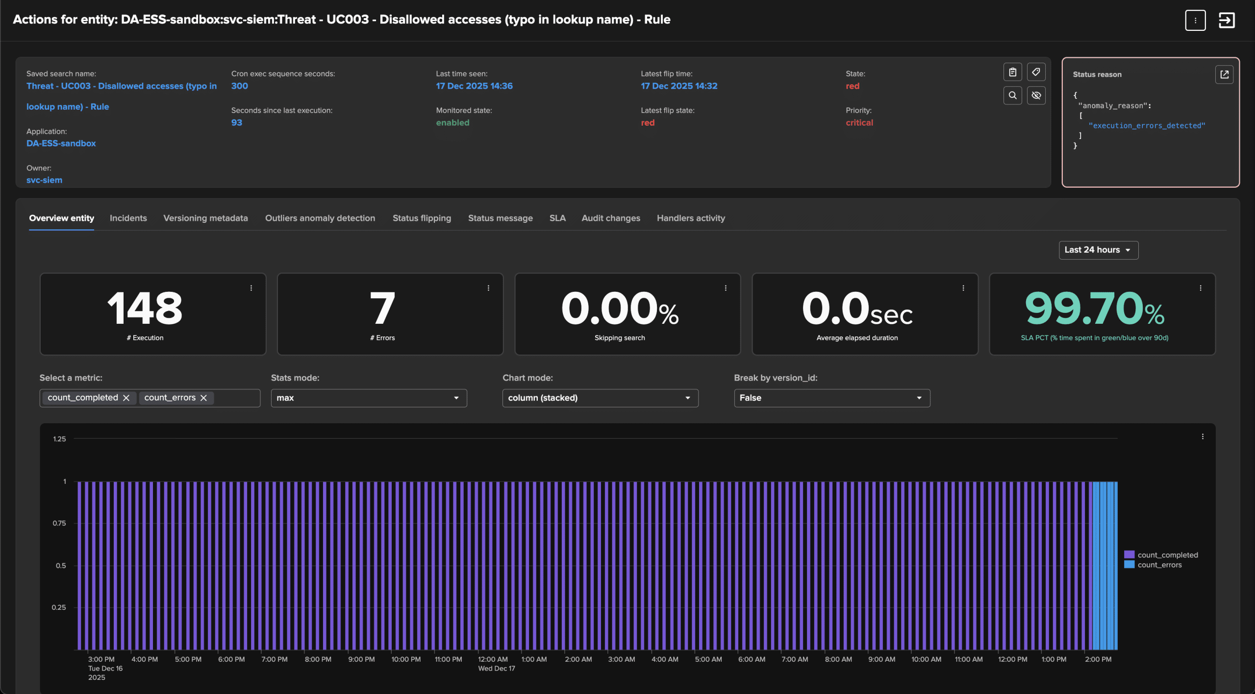 The Workload component identifies scheduled activities within your Splunk deployment, whether local or remote, and continuously monitors their performance and anomalies over time. It detects various conditions such as execution errors, scheduling issues, assignment problems, delayed use case executions, and more.