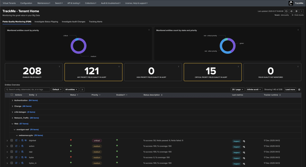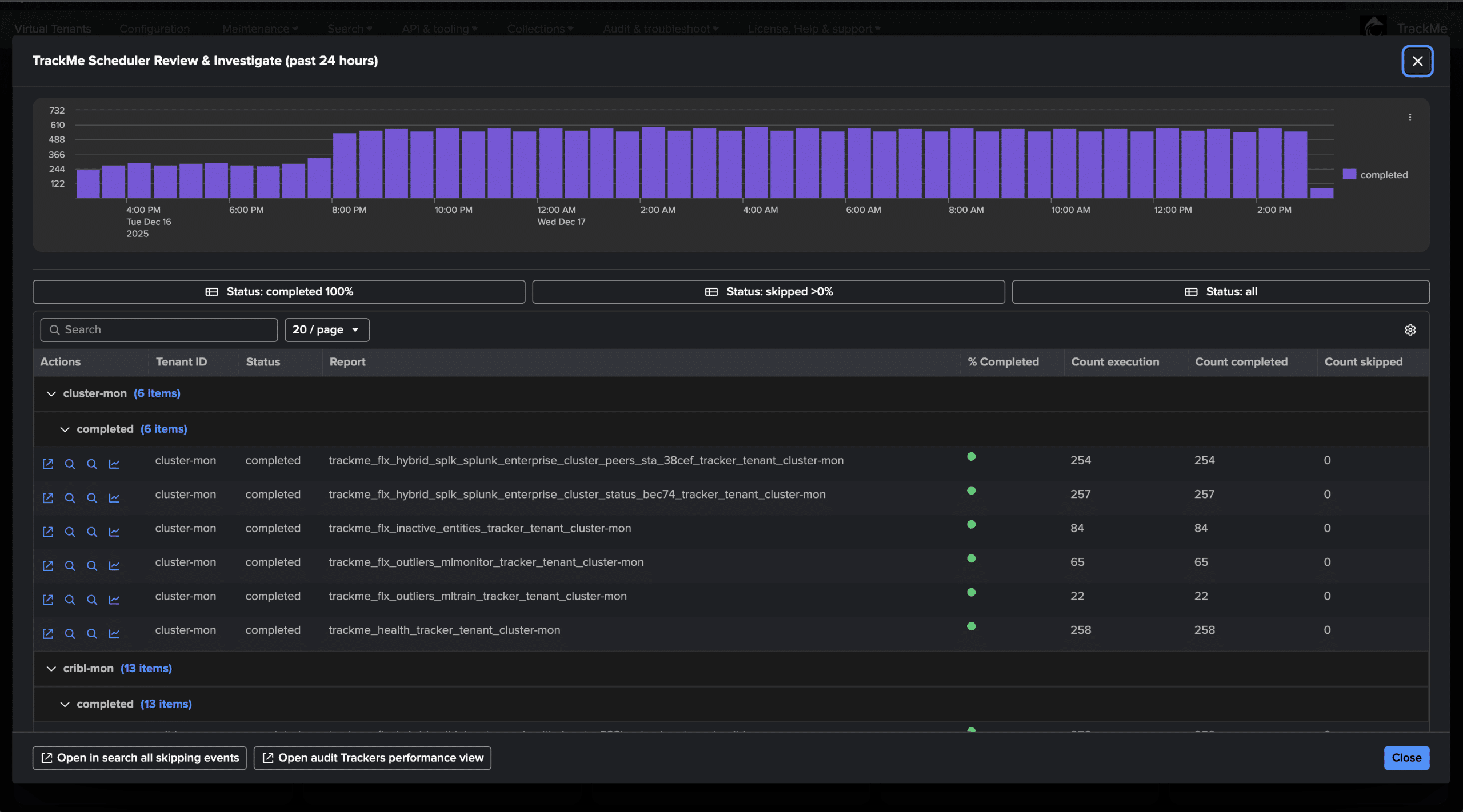 TrackMe carefully monitors the state and health of every active Virtual Tenant, potential tracker failures or misconfigurations are detected, logged and exposed to provide you the greatest visibility.