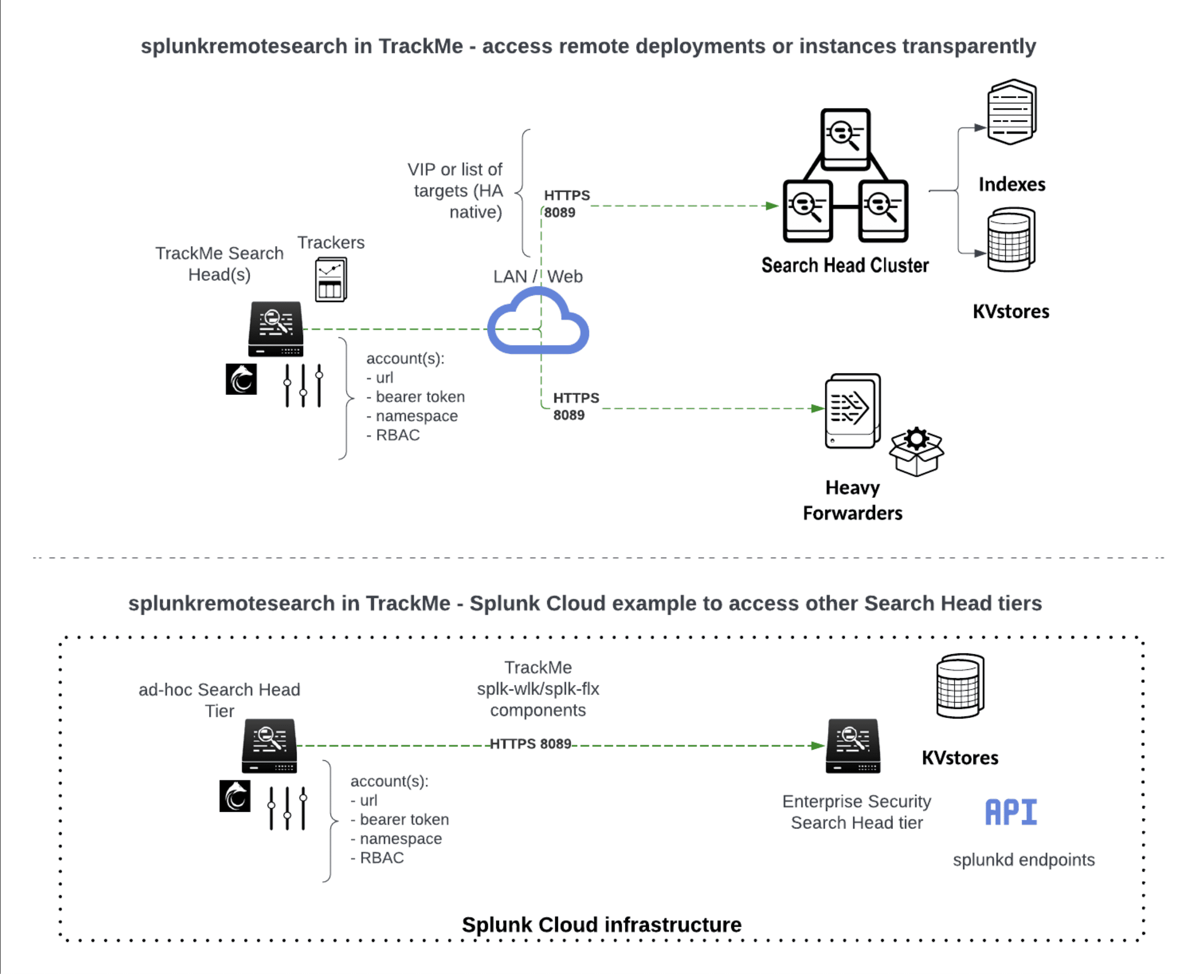 TrackMe incorporates a concept of Remote Splunk accounts, allowing you to define an account by specifying its URL-based access while utilizing a bearer token for secure SSL connectivity. TrackMe's remote search integration also addresses High Availability and Load Balancing concerns. By defining multiple API endpoints, TrackMe will evenly distribute searches among accessible endpoints.