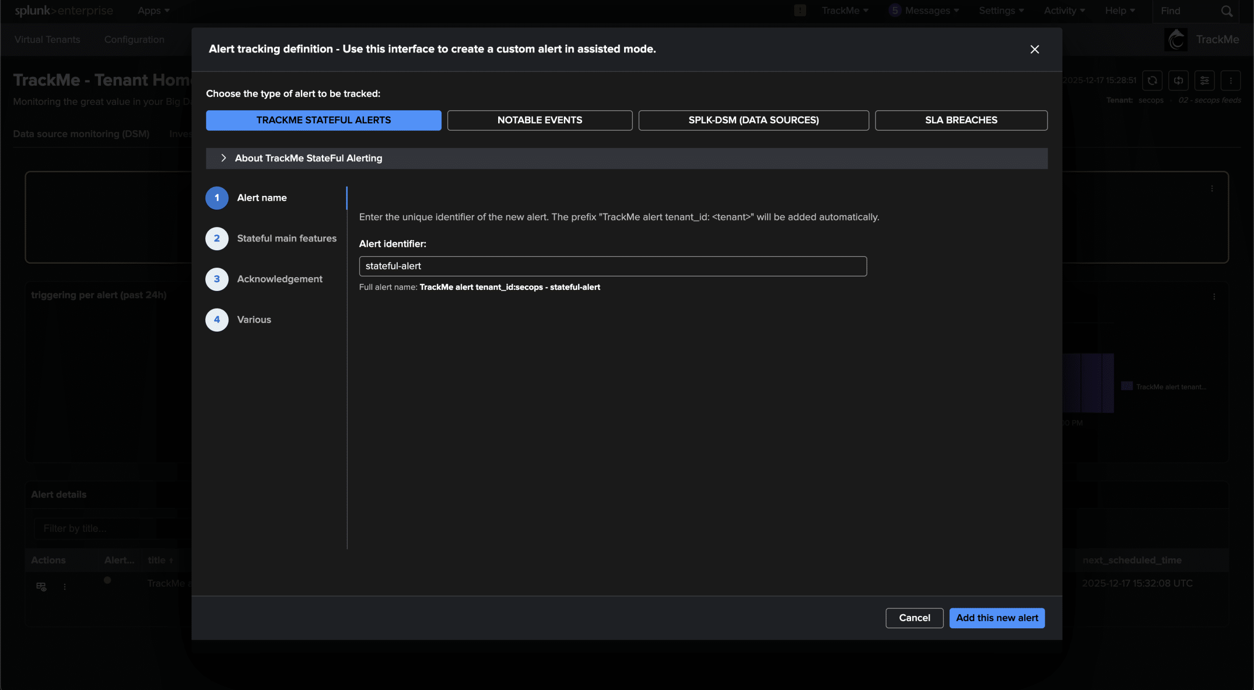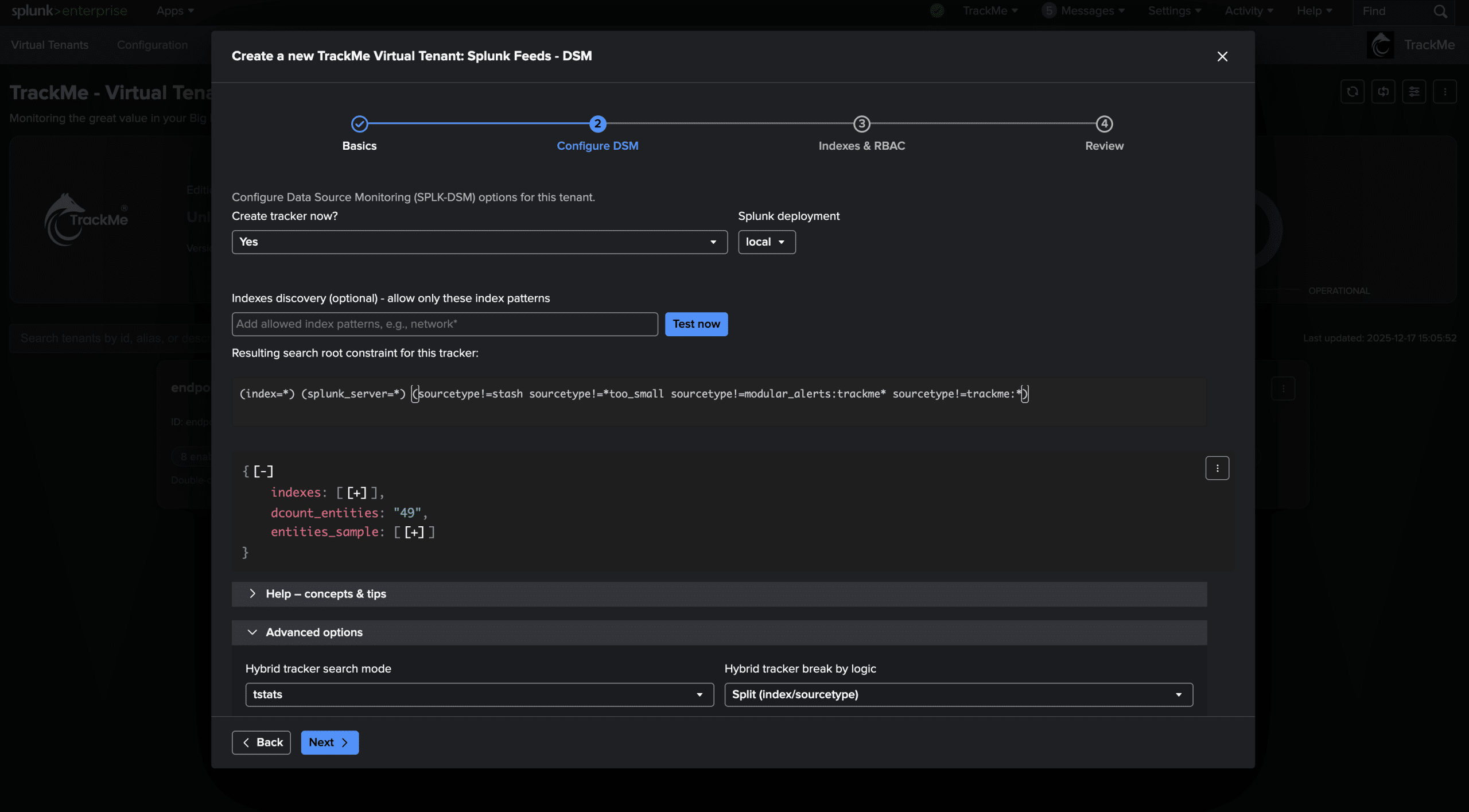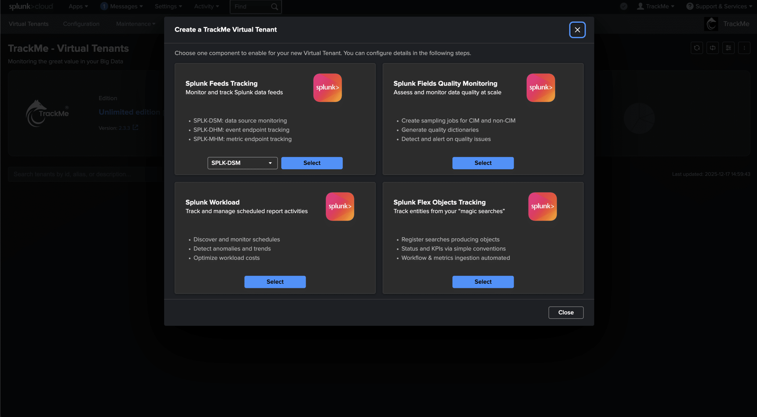 When creating a Virtual Tenant, you can choose a TrackMe component, set primary options, and even create Hybrid trackers during the creation phase, depending on the available TrackMe components.
