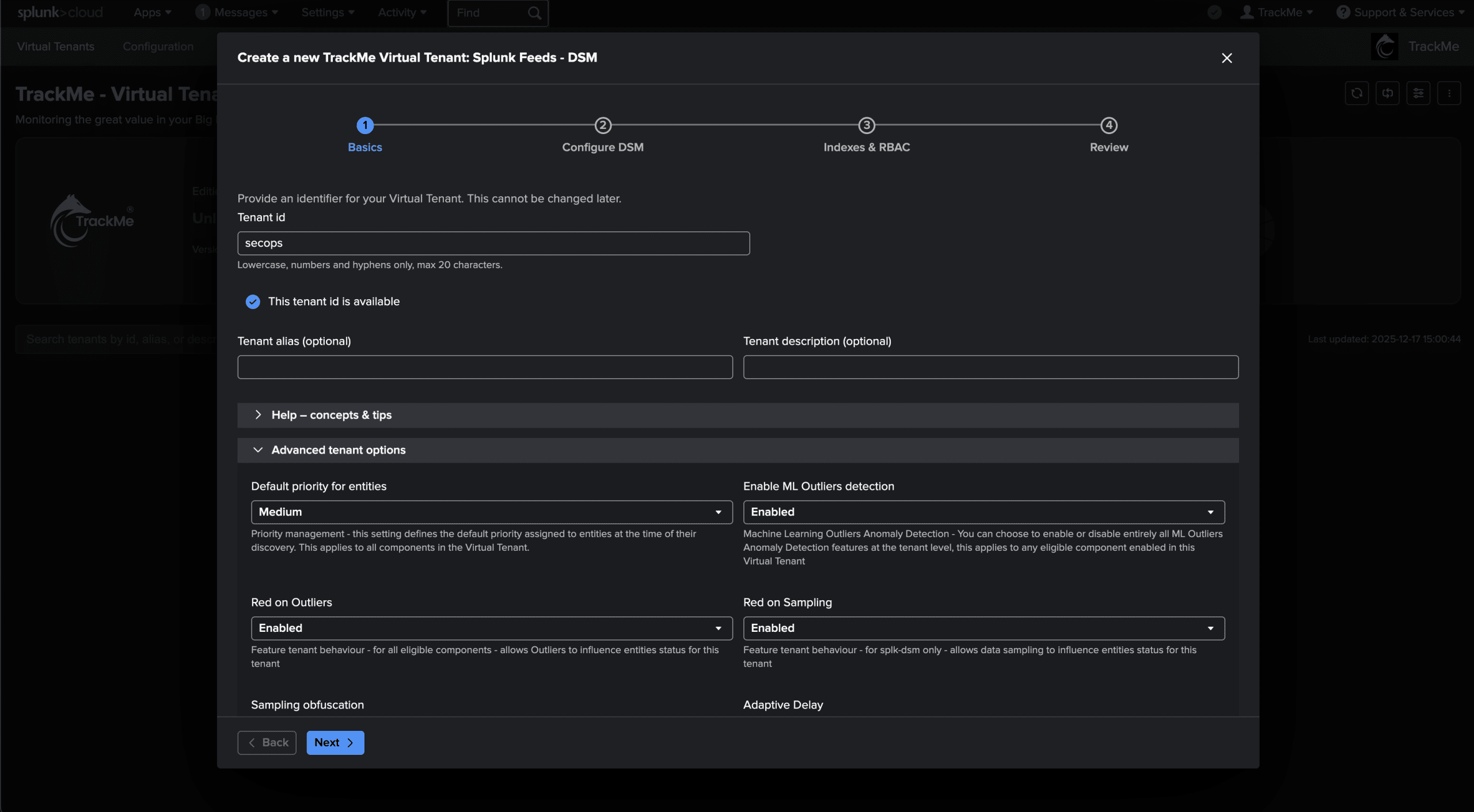 TrackMe was designed with multi-tenancy in mind. When creating a Virtual Tenant, you can optionally define the target indexes for TrackMe data and metrics, allowing you to leverage Splunk's RBAC capabilities to control access easily. This feature is seamlessly supported within TrackMe.