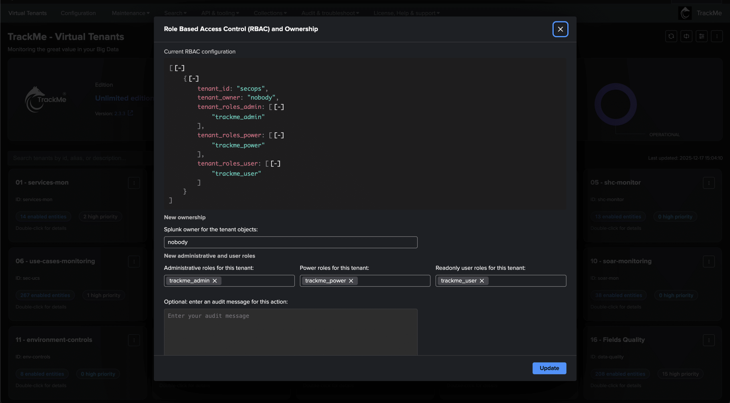 TrackMe manages it all for you, from every single object such as Hybrid Trackers or alerts that were created, you can disable a Tenant, or purely delete it and let TrackMe handle the cleaning for you. You can as well re-assign objects, or update RBAC policies accordingly.