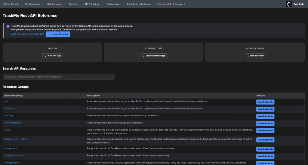 In TrackMe, everything revolves around API endpoints. In fact, any action that can be performed through the user interface can also be accomplished via a REST API endpoint, allowing for easy execution and automation both within and outside of Splunk.