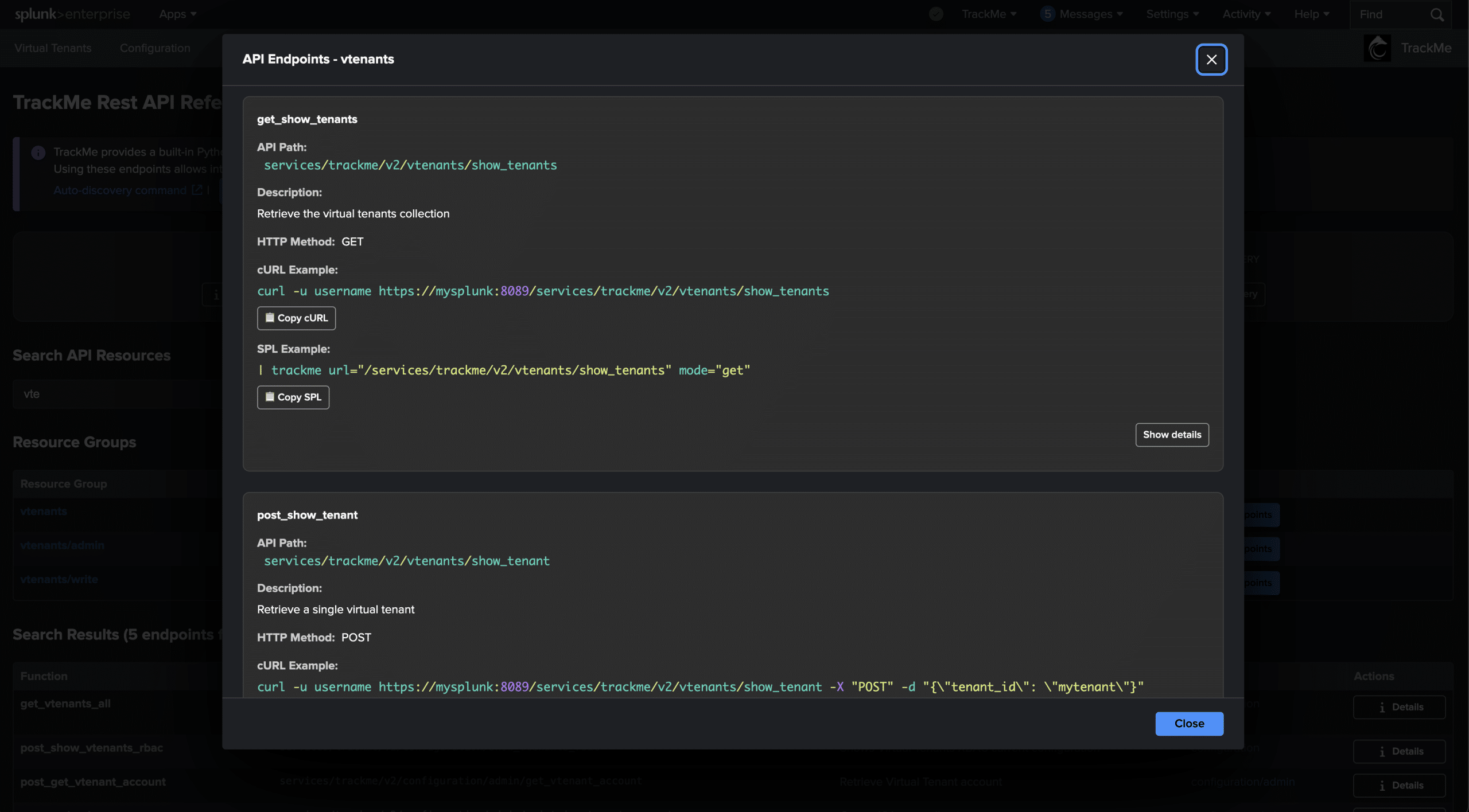 TrackMe heavily relies on its comprehensive REST API endpoints to carry out various operations, ranging from creating Virtual Tenants and Hybrid Trackers to managing the product life cycle. Anything you can accomplish in the UI can be done through its REST API!