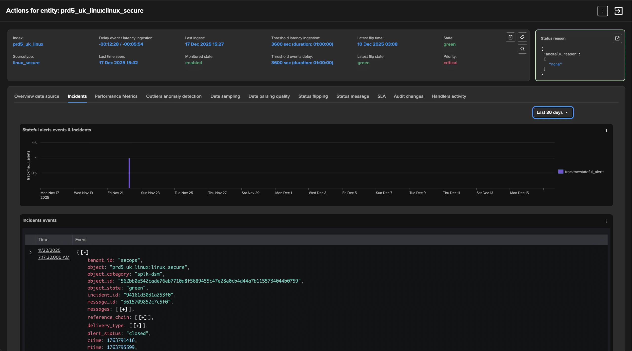Beyond stateful monitoring, TrackMe generates notable alerts enriched with deep operational context. Each alert includes entity details, anomaly reasons, KPIs, timelines, and historical trends, allowing teams to understand why an alert occurred, not just that it occurred.