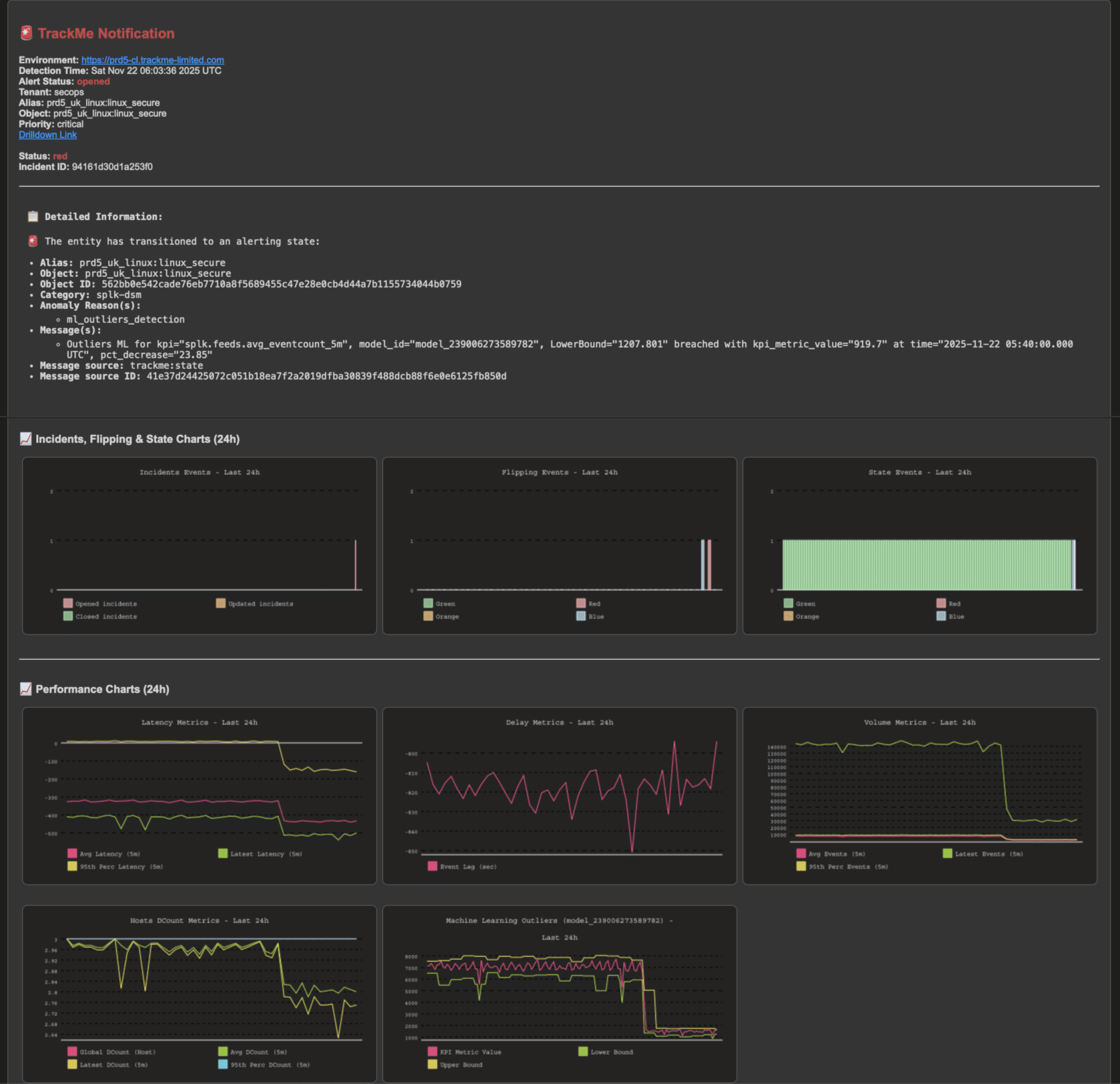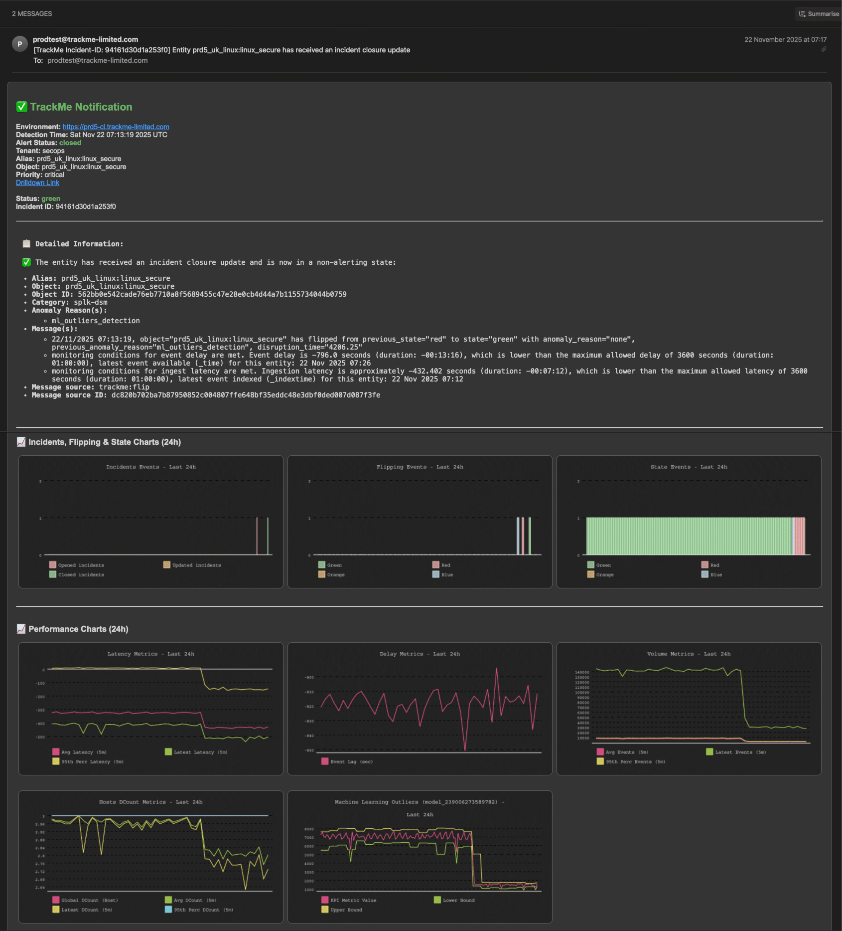 TrackMe provides a powerful, built-in email notification engine with enterprise-grade behaviors, including intelligent alert threading across the full incident lifecycle, rich HTML notifications with embedded charts and metrics, and consistent incident identifiers that clearly distinguish alert creation, updates, and resolution.